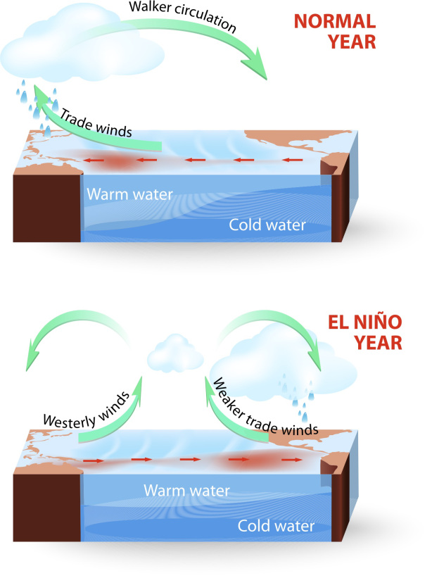 Whereas now the likelihood of a super El Niño is one every twenty years or so, as the planet warms that number will change to one every ten years. El Niños will still occur on about the same schedule, but more of them will be abnormally strong.